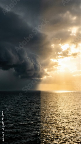 Dark storm clouds and bright sunlight over ocean. Split image of light and darkness. Creation of light and dark on the first day.