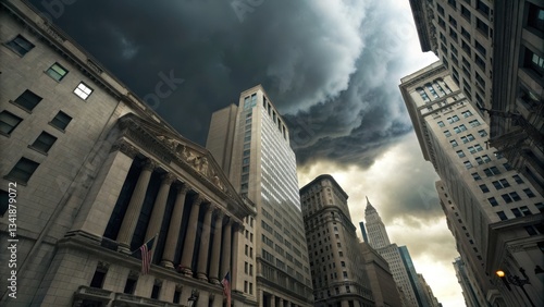 Dark storm clouds loom over a financial district with neoclassical and modern skyscrapers, symbolizing economic uncertainty, market downturns, and financial crises.