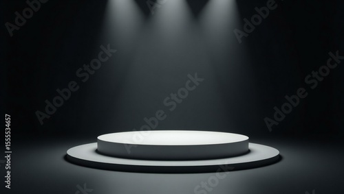 pedestal, dais, stage, platform, display, product, spotlight, lighting, dark, background, minimal, minimalist, clean, simple, studio, presentation, circular, round, grey, white, three-dimensional, rendering, empty, blank, photo, show, exhibition, award