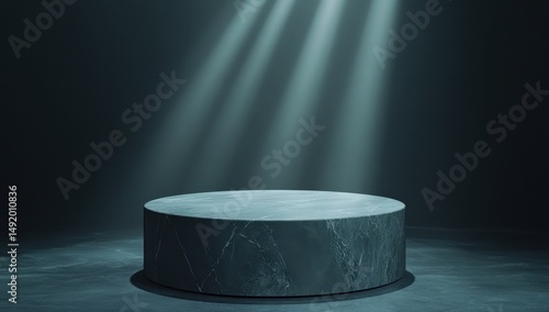 Dark, teal marble podium, spotlight beams