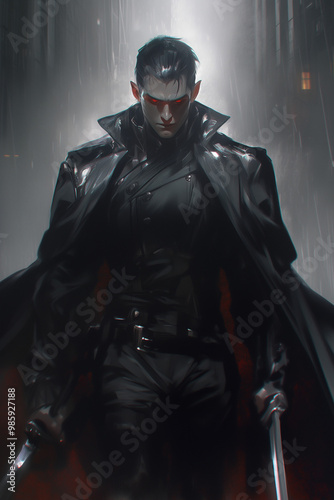 vampire, male, warrior, sword, red, eye, rain, dark, city, night, glow, raincoat, fierce, weapon, dangerous, urban, powerful, undead, gothic, mysterious, sleek, shadow, intimidating, slick, bloodthirsty, battle, fighting, black, intense, aggressive, coat, strength, rainstorm, sharp, city landscape, cloak, blood, evil, supernatural, menace, hunter, action, assassin, predator, wet