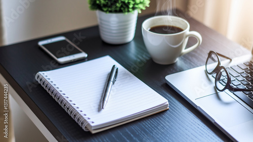 Dark wood desk with notebook, pen, coffee, phone, glasses, and laptop. Represents productivity, work, and a modern workspace. Free space for text or mockup