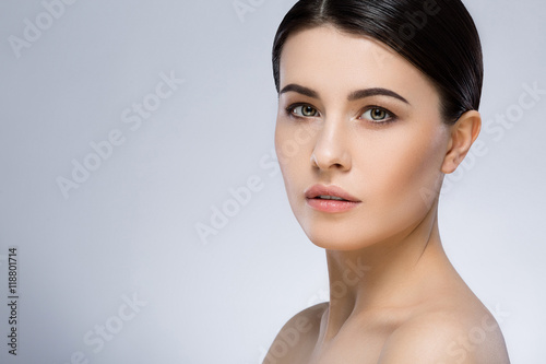Darkhaired girl with nude make up at studio