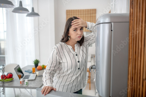 missy, dark-haired, overweight, beautiful, pretty, generation y, home, loft, apartment, caucasian, alone, indoor, refrigerator, refrigerator, ravenous, hunger, upset, temptation, tempting, female, femininity, one person, distress, stressed, unhappiness, unhappy, desire, forbidden, control, determination