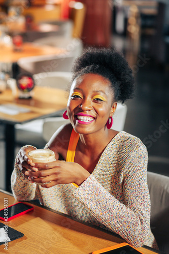 enjoy, hot drink, break, time, cup, latte, woman, female, girl, long-haired, happy, satisfied, smile, eatery, cafeteria, cafes, healthy, food, gastronomy, brunch, lunch, breakfast, tasty, delicious, modern, generation, smartphone, study, preparation, assignment, friends, fun, freelancer, smart, emotion, feeling, clothes, eat, drink, service, comfort, rest, relaxation, topview, closeup