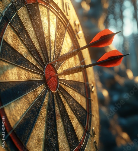 Dartboard with Arrows Hitting Bullseye in Bright Sunlight