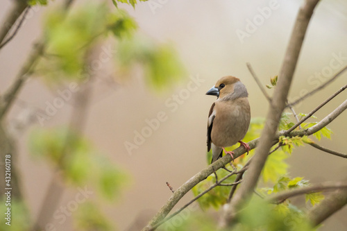 Das Weibchen eines Kernbeißers auf einem Zweig
