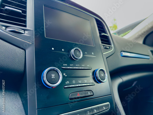 Dashboard of a modern vehicle showing controls and display during a sunny day drive in a serene environment