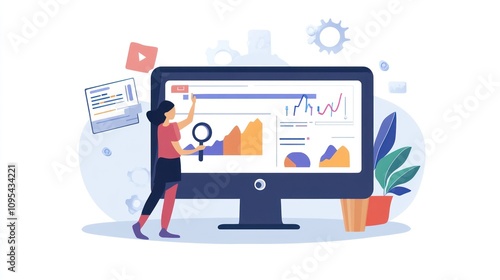 datum, analysis, chart, graph, woman, computer, screen, magnifying, glasses, business, technology, information, research, dashboard, digital, statistic, monitoring, performance, progress, growth, trend, visualisation, strategy, planning, management, reporting, market, marketing, sale, finance, economy, web, online, application, software, system