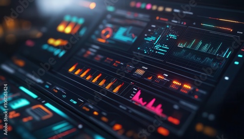 Data analytics dashboard with vibrant graphs and charts, sleek interface, soft lighting, modern tech setup, realism