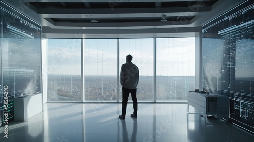 technology, businessman, office, innovation, cyberspace, futuristic, global, software, cyberspace, networking, communication, data storage, top, data transfer, concept, information, digital, computer, web, connection, network, datum, screen, digital display, monitor, person, silhouette, window, interior, business, urban, architecture, people, corporate