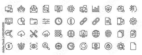 technology, datum, icon, vector, set, line, security, business, computing, finance, management, digital, development, process, cogwheel, setting, server, chart, folder, shield, error, link, time, document, switch, chips, tool, cloud, download, upload, globe, currency, fingerprint, bug, target, search, key, machine, intelligence, minimal, outline, scalable, collection, pictogram, illustration