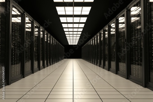 Data Center Hallway with Servers Racks, White Tile Floor and Rectangular Lights
