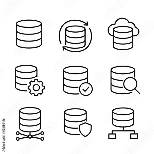 icon, database, line, datum, storage, system, icon, server, cloud, information, technology, computing, network, backup, security, query, administration, infrastructure, outline, black, linear, hosting, datacenter, archive, repository, warehouse, migration, synchronization, optimization, performance, monitoring, maintenance, vector, symbol, pictogram, illustration, design, graphic, information technology, tech, digital, computer, software, management, set