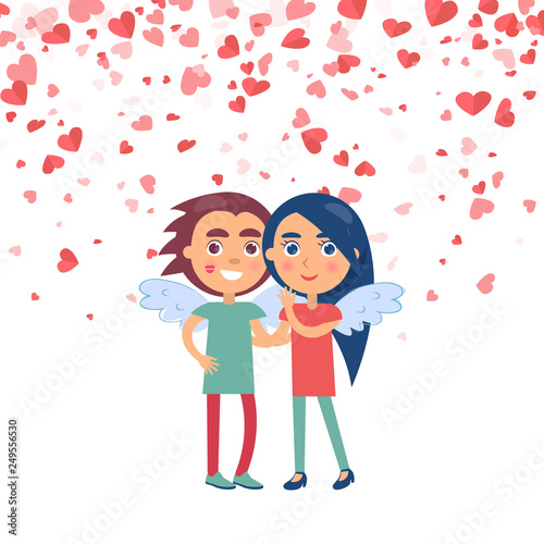 Dating girlfriend and boyfriend vector. Smiling lovers in angels wings, cartoon style teenagers isolated on background with pink paper cut hearts, vector