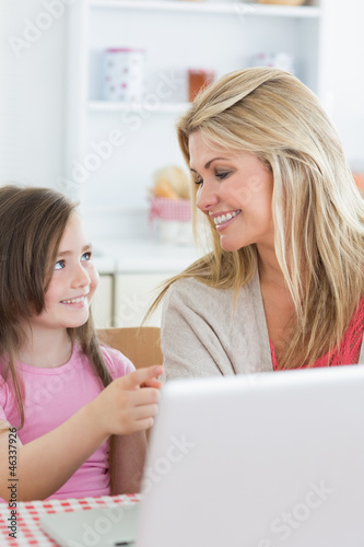 Daughter pointing at laptop with mother