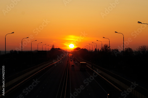dawn and sunset on the road, transport at dawn, cars go to sunset