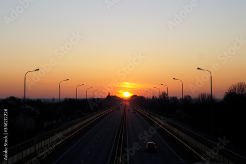 dawn and sunset on the road, transport at dawn, cars go to sunset