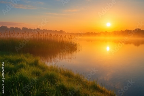 Dawn light illuminating a foggy wetland with tall grasses beside a tranquil lake during spring