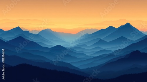 Dawn over layered mountain ridges and fog