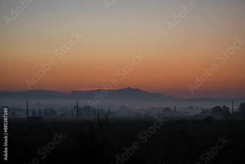 dawns behind the mountain with fog at its feet