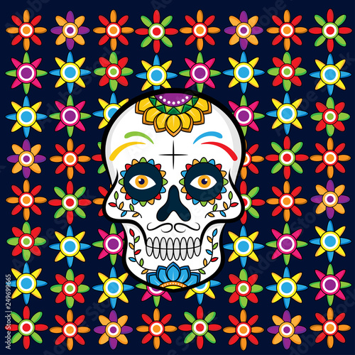Day of the dead, Dia de los moertos, banner with colorful Mexican flowers. Fiesta, holiday poster, party flyer, funny greeting card - Vector