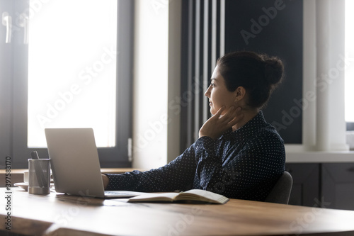 Daydreaming. Smiling young mixed race female taking short break in distant working learning lost in pleasant thoughts. Thoughtful indian lady look at window create plans visualize successful result