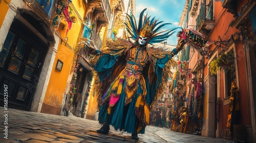 performer, masked, costume, vibrant, standing, alleyway, colourful, festival, art, celebration, elaborate, feather, adornment, tradition, cultural, expression, creative, theatrical, street, scenery, ornate, character, festive, unique, design, visual, portrait, attractive, craftsmanship, historic, architecture, lively, mood, joyful, striking, beauty, stunning, stylish, fashion, heritage, artistry, display, captivating, flamboyant, flair, charme, environment