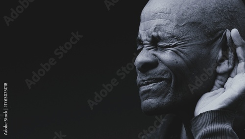 deaf man suffering from deafness and hearing loss on black gray background with people stock photo stock image