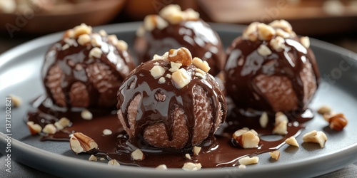 Decadent chocolate dessert balls drizzled with sauce and sprinkled with nuts on a plate