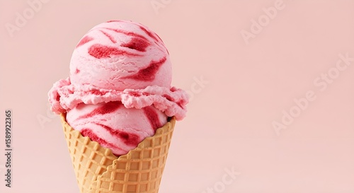 Decadent Raspberry Cheesecake Ice Cream in Waffle Cone on Light Pink Background with Soft Shading – Creamy Dessert Fusion with Sweet Berry Swirl, Cheesecake Chunks, and a Dreamy Pastel Aesthetic