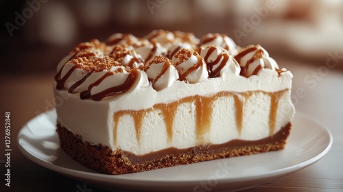 Decadent slice of caramel cream pie with whipped topping and graham crust on white plate