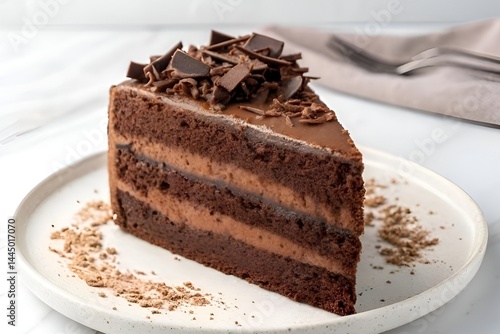 Decadent Triple-Layer Chocolate Cake Slice with Elegant Shavings