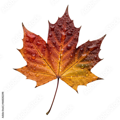 Decaying autumn maple leaf, wet with water droplets, reddish-brown, orange, yellow, intact stem, on transparent studio background, top-down. Concept of natural decomposition and scientific precision