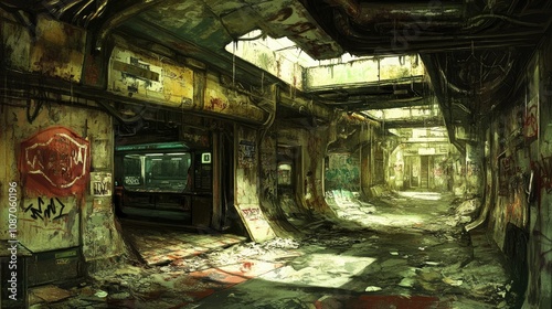 Decaying futuristic corridor, overgrown with vines and graffiti.