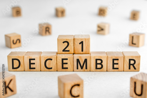 December 21 - from wooden blocks with letters, important date concept, white background random letters around