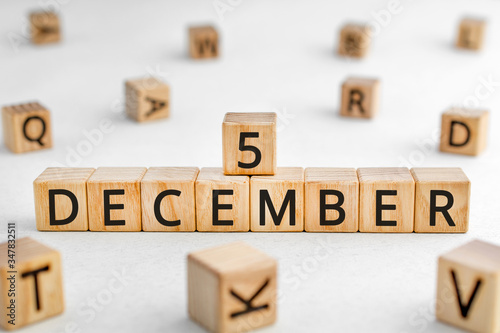 December 5 - from wooden blocks with letters, important date concept, white background random letters around