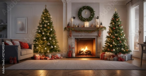 Decorated Christmas tree in a cozy living room with a fireplace, festive, fireplace, living room