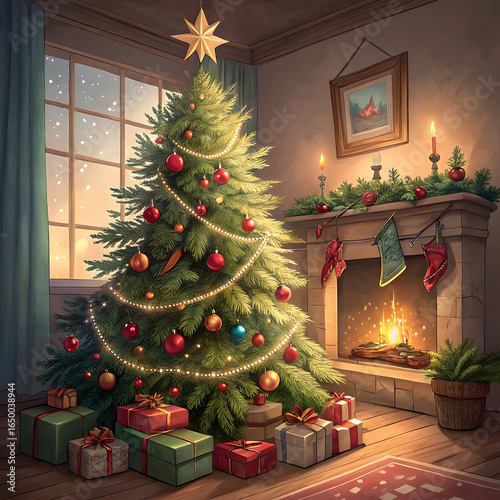 christmas, tree, room, fireplace, present, gift, winter, holiday, cosy, warm, lighting, candle, stocking, evergreen, ornament, red, green, gold, light, star, snow, window, wooden, floor, festive, celebration, family, home, comfort, joy, peace, happiness, illustration, digital, art, graphic, background, texture, image, design