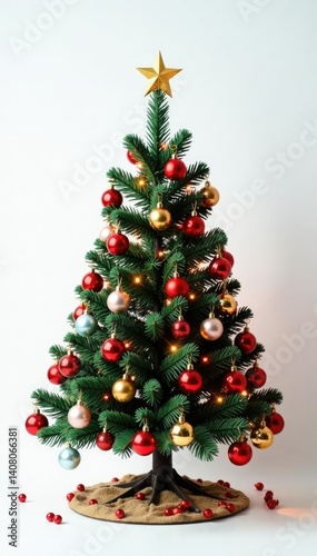 Decorated Christmas tree on white background with ornaments and lights, Colorful, Christmas Tree
