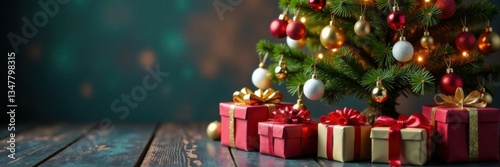 Decorated Christmas tree surrounded by festive gifts and colorful ornaments, Christmas decorations, bows