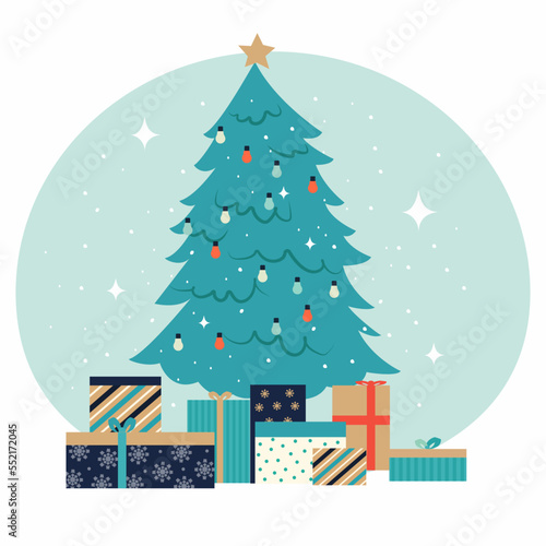 Decorated Christmas tree with gift boxes, star, lights, decorative balls and lamps. Merry Christmas and Happy New Year. Flat style vector illustration.