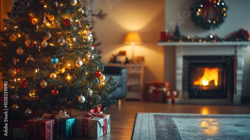Decorated Christmas Tree With Gifts Underneath In Front of a Fireplace