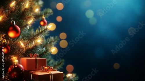 christmas, tree, light, ornament, red, green, gold, present, gift, ribbon, bow, blue, festive, holiday, december, celebration, sparkle, joy, magic, winter, season, decoration, glow, night, dark, bokeh, background, card, image, graphic, design, abstract