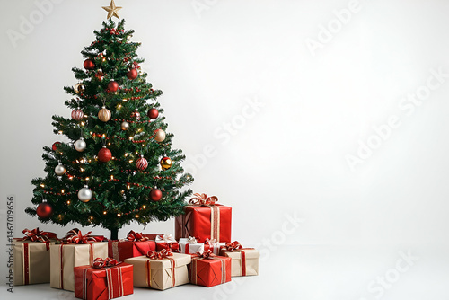 Decorated Christmas Tree with Red and Gold Presents Against White Background