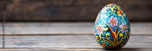 Decorated Easter Egg on Wooden Table - A single, hand-painted Easter egg with floral designs rests on a rustic wooden surface.