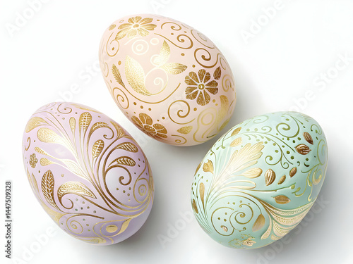 Decorated Easter Eggs with Gold Floral Designs on White Background
