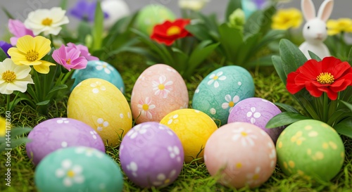 egg, decorating, lying, flower, blooming, moss, growing, springtime, season, pastel, yellow, pink, purple, green, blue, white, flora, floral, plant, closeup, still life, holiday, celebrate, design, ornament, arrangement, festive, tradition, symbol, decoration, grass, garden, background, copy space, concept