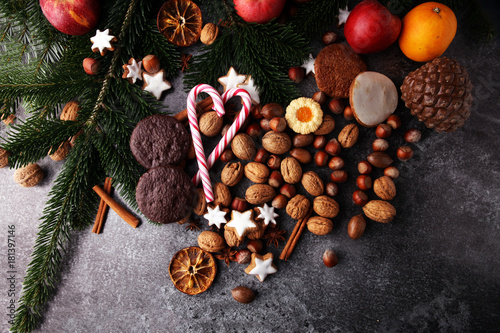 Decoration with christmas cookies. Typical cinnamon stars with fruits and nuts.