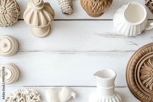 Decorative Art Pieces and Ceramics on White Wooden Background